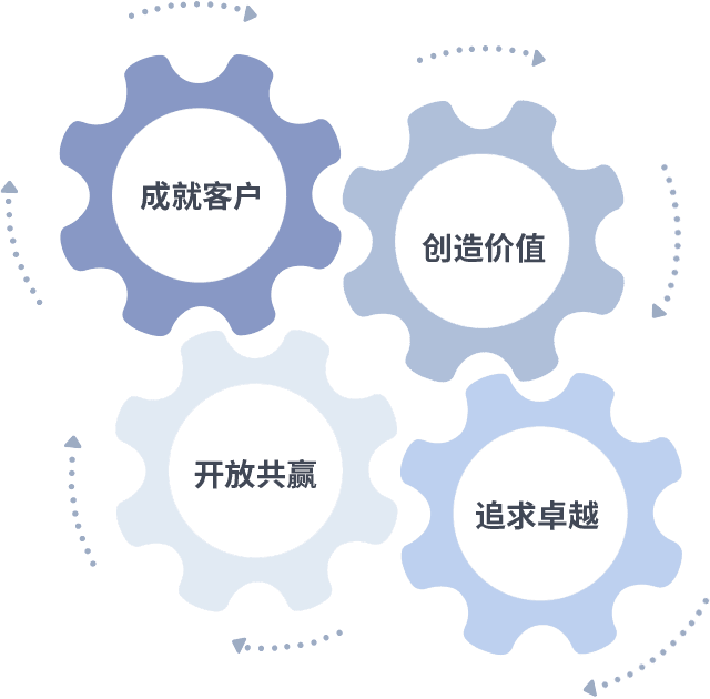 成就客户是一切决策的出发点,,创造价值是衡量所有工作的标准,,,,追求卓越是我们做事做人的态度,,,开放共赢是我们的格局也是最终的结果。。价值观的齿轮环环相扣,,推动着组织里的每个人不断向前。。。