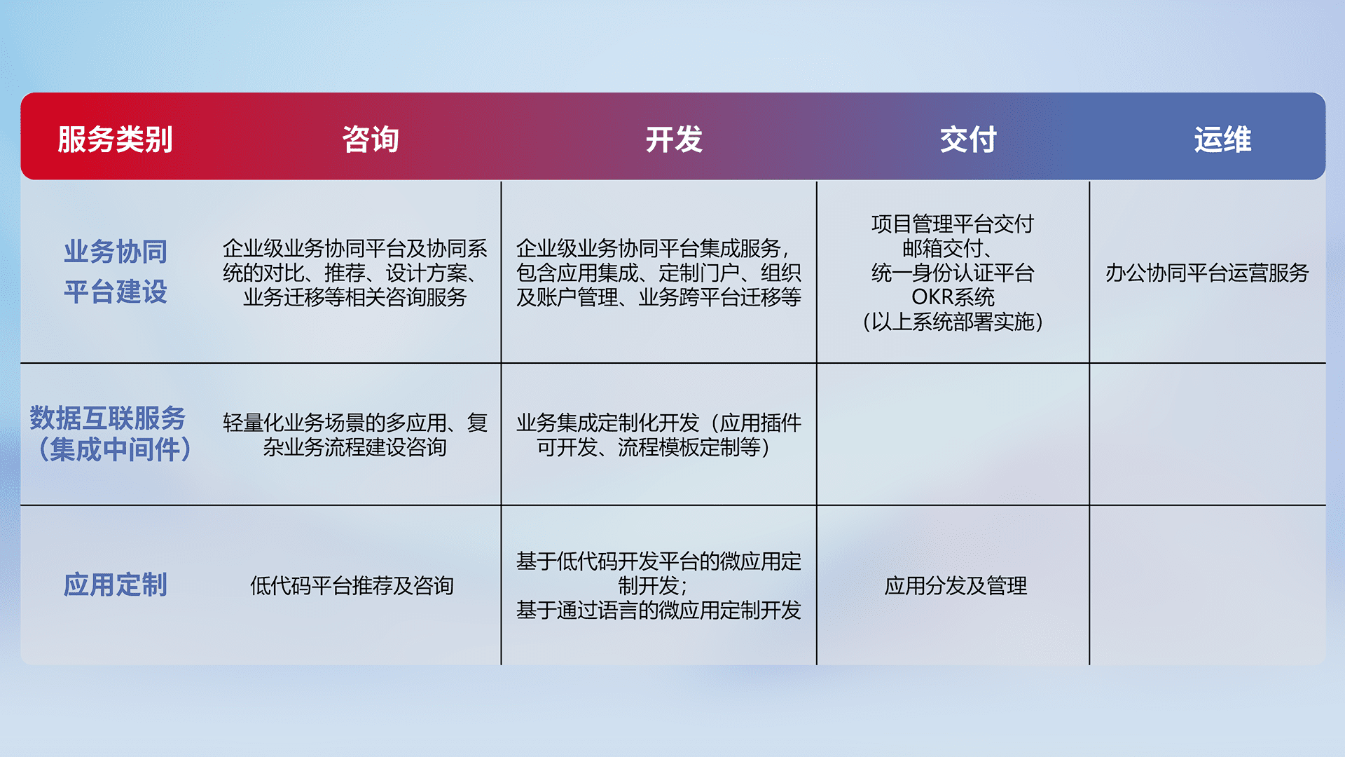 针对钉钉、、企微、、、、IDaas等平台级产品提供产品的规划、、、、方案、、、交付、、、定制化开发等服务,,,实现如统一协同办公、、智能客户服务、、混合会议管理、、智能数据查询、、等业务场景,,,,实现数字化转型。。。